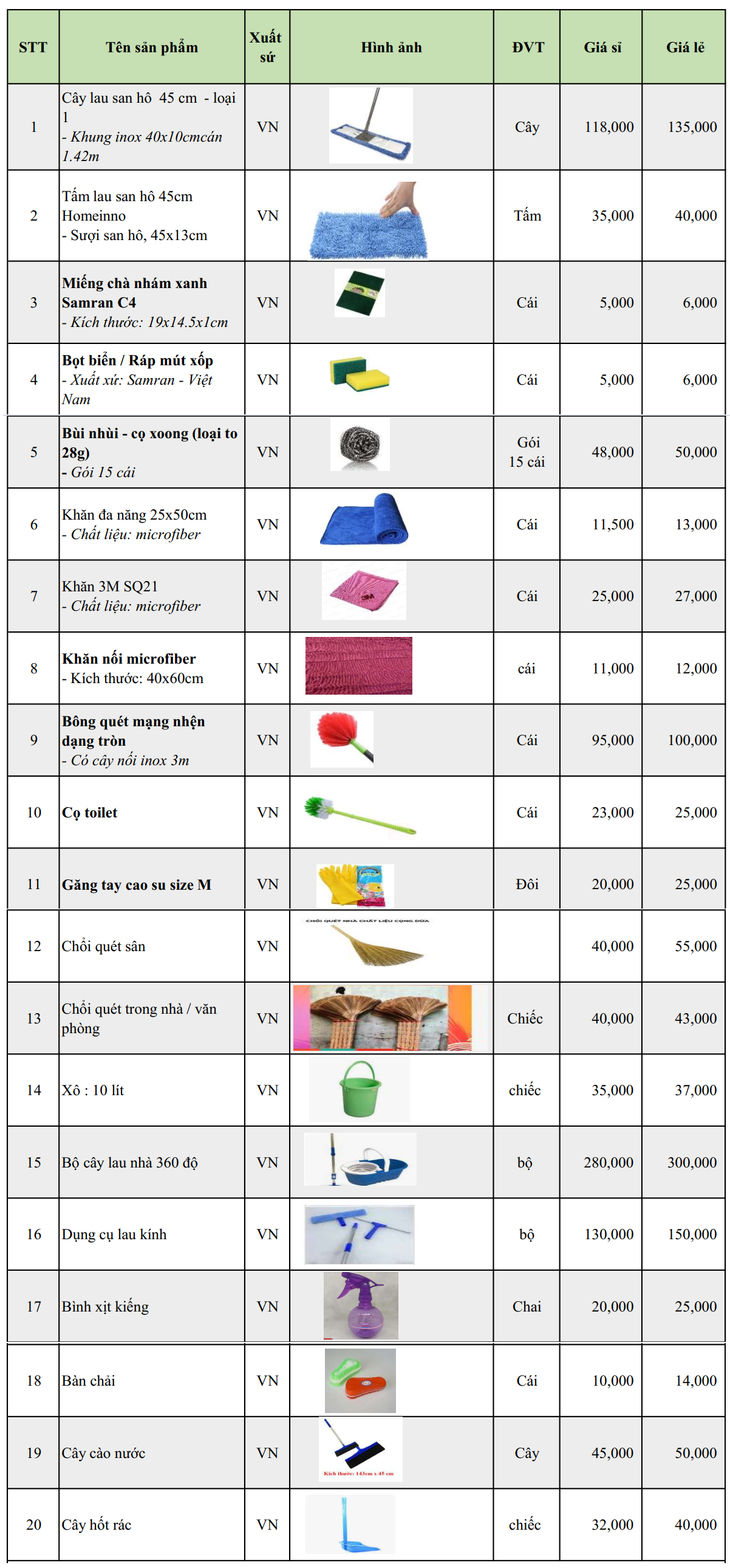 BẢNG GIÁ DỤNG CỤ VỆ SINH