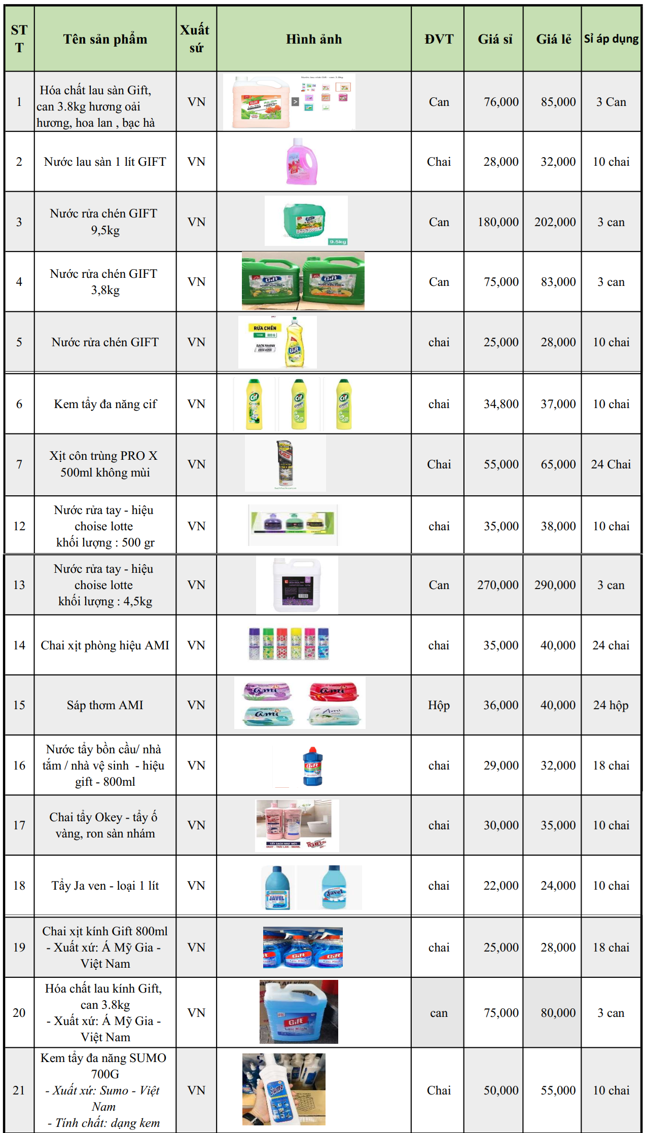 BẢNG GIÁ HÓA CHẤT VỆ SINH